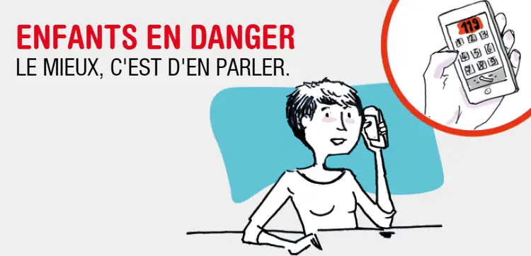 - 119 : numéro pour les victimes ou témoins de violences physiques, psychologiques ou de négligences sur un enfant – 24h/24, 7/7, gratuit, n’apparaît pas sur la facture téléphonique et peut-être anonyme.